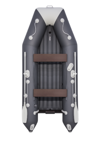 Надувная лодка «АКВА» 3400 НДНД — 3-местная модель, на которую можно установить мотор мощностью до 15 л.с. Для удобства переноса судна на носу и корме размещены ручки. Также на лодку установлены уключины поворотного типа и защелки для весел. Чтобы повысить надежность конструкции, транец помещается в специальный пластиковый транцевый пояс.