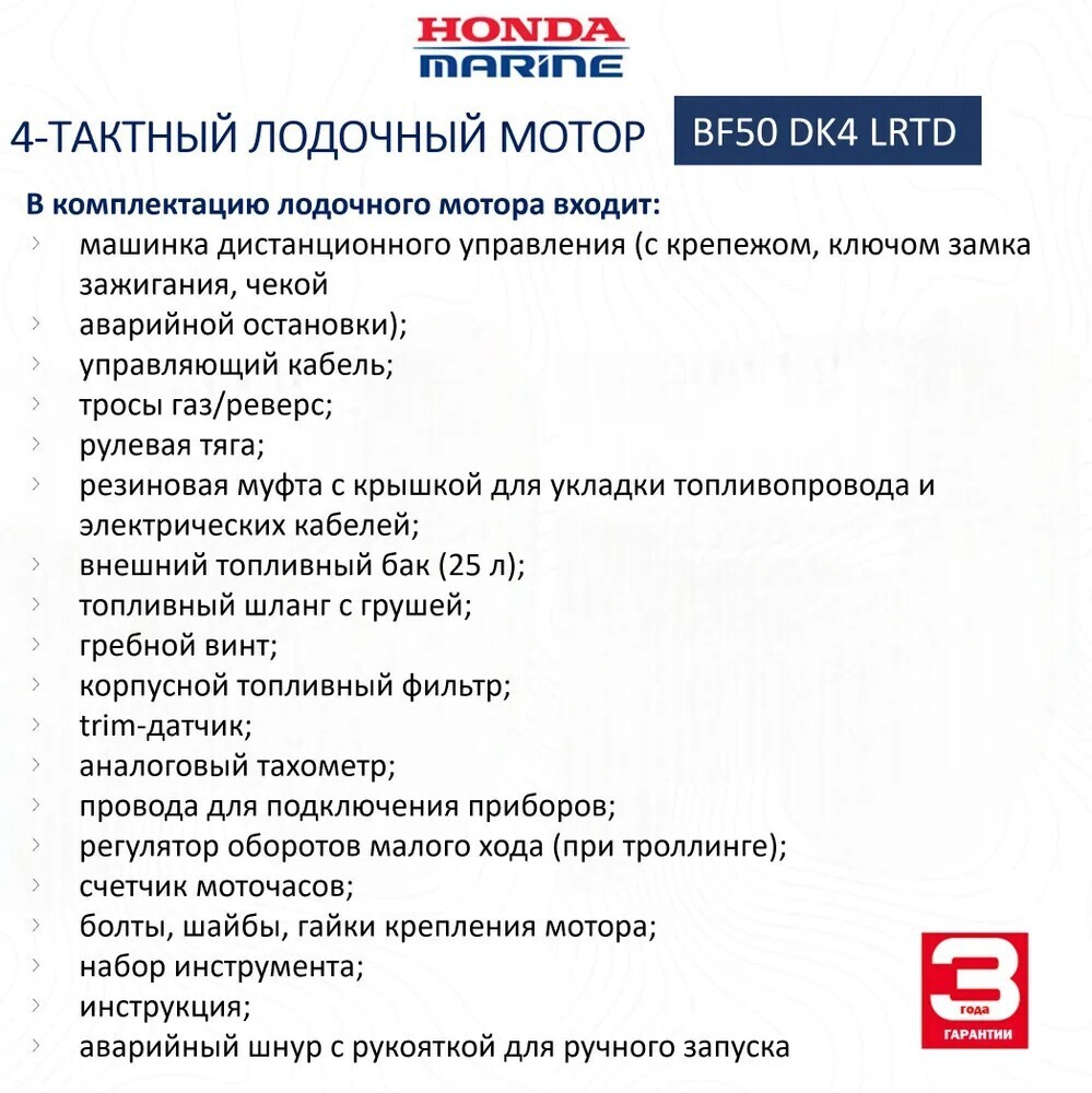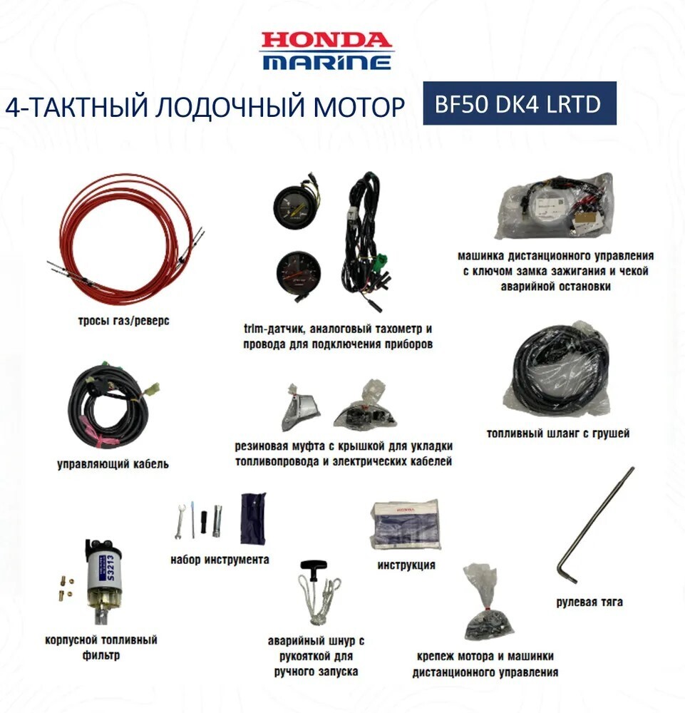 - Оснащение: машинка дистанционного управления (с крепежом, ключом замка зажигания, чекой аварийной остановки); управляющий кабель; тросы газ/реверс; рулевая тяга; резиновая муфта с крышкой для укладки топливопровода и электрических кабелей; внешний топливный бак (25 л); топливный шланг с грушей; гребной винт; корпусной топливный фильтр; trim-датчик; аналоговый тахометр; провода для подключения приборов; регулятор оборотов малого хода (при троллинге); счетчик моточасов; болты, шайбы, гайки крепления мотора; набор инструмента; инструкция;аварийный шнур с рукояткой для ручного запуска.